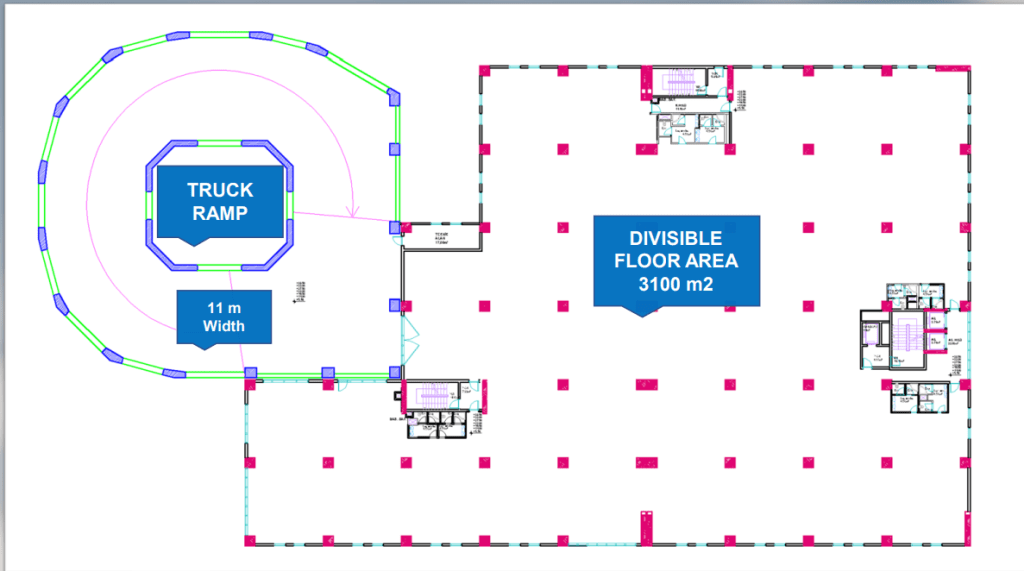 thanks to the 11-meter wide truck ramp. - Each floor has a rentable area of 3,100 m2, totaling 11 floors,
